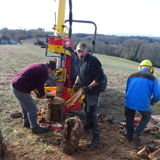 Nous étions une vingtaine avec couteaux, hachoir, tronçonneuse et fendeuse, résultat une cinquantaine de boudins confectionnés et 8 stères de bois prêts à alimenter notre poêle.